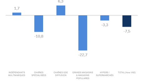 Les chiffres d’affaires de l’ensemble des circuits de distribution (hors VAD) – ventes en ligne comprises – ont connu un recul de 7,5 % au cours du dixième mois de l’année. Les évolutions sont très contrastées selon les différents circuits de distribution. Si les chaînes grande diffusion ont bénéficié d’une croissance de leur activité commerciale (+ 6,3 %), les grands magasins restent toujours pénalisés par l’absence de la clientèle étrangère : – 22,7 %, magasins populaires inclus.