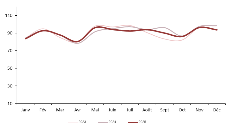 Les données définitives de décembre 2025 indiquent un recul de 4,3 % des ventes en valeur d’habillement par rapport à décembre 2024. L’inhabituelle douceur des températures du dernier mois de l’année a pesé sur la consommation. Selon Météo-France, le mois de décembre a été particulièrement doux, notamment entre le 5 et le 22, période pendant laquelle les températures moyennes ont été supérieures de 3,5 degrés à celles observées entre 1991 et 2020.