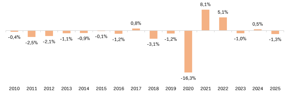 Le bilan de l’année 2025 affiche un retrait de 1,3 %