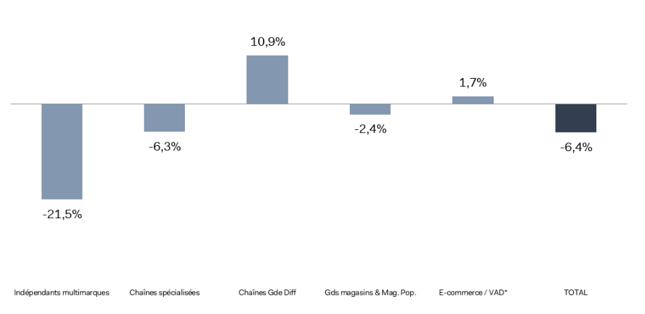 Tous les circuits de distribution ont subi une baisse de leur activité commerciale. Les résultats sont compris entre un retrait de 0,9 % pour la VAD et un recul de 6,4 % pour les indépendants multimarques. Au mois de décembre, les chiffres d’affaires des magasins physiques ont connu une diminution de 4,8 % par rapport à décembre 2024, le commerce en ligne ayant affiché une baisse moins importante (- 1,8 %).