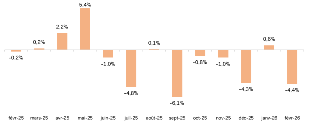 Évolutions mensuelles des ventes d’habillement de février 2025 à février 2026