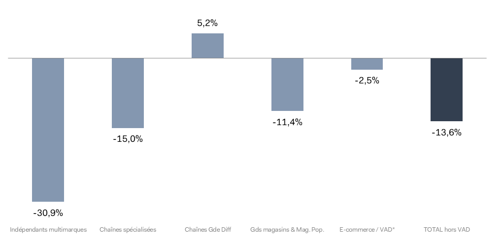 Selon les circuits de distribution, les résultats sont contrastés et s’échelonnent de + 3,3 % pour les chaînes grande diffusion à – 0,6 % pour les chaînes spécialisées. Dans l’ensemble, les ventes en ligne sont nettement mieux orientées (+ 3,2 %) que celles des magasins : – 0,9 % par rapport à janvier 2025.