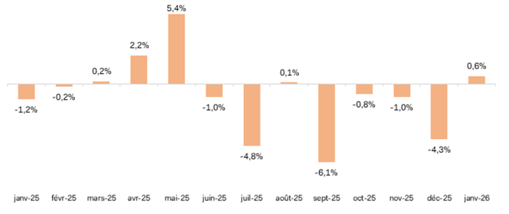 Évolutions mensuelles des ventes d’habillement de janvier 2025 à janvier 2026