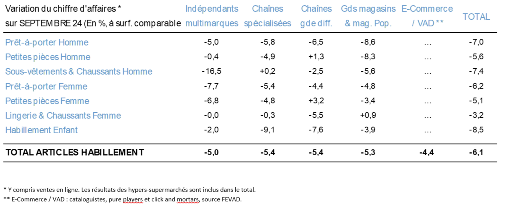 Évolutions mensuelles des ventes ‘habillement de septembre 2024 à septembre 2025