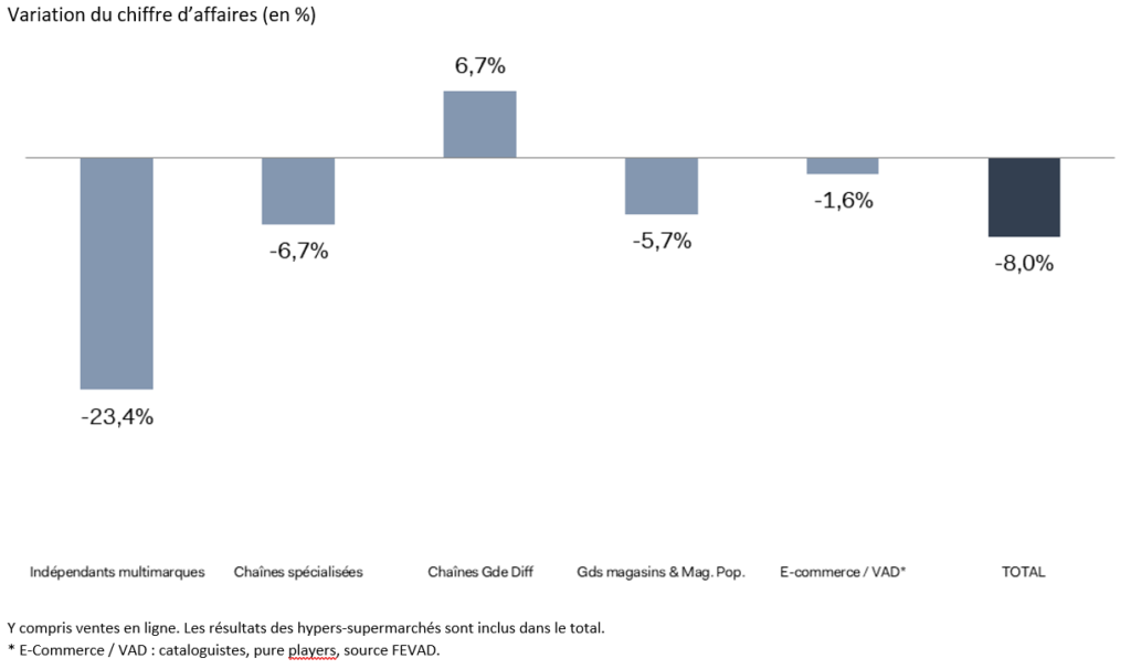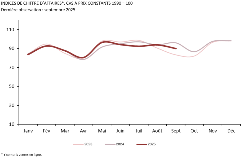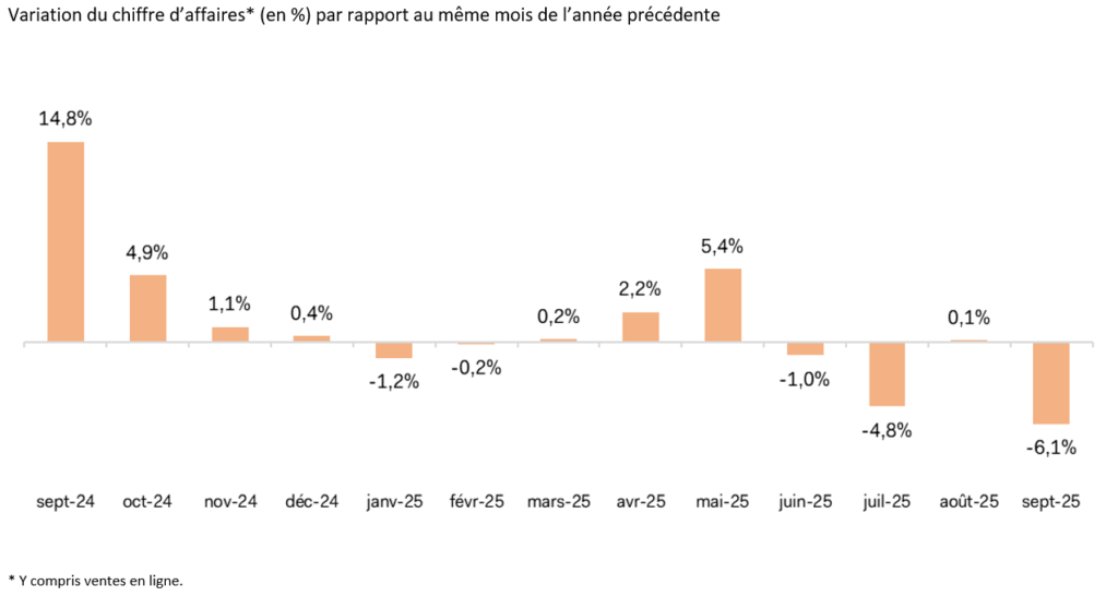 Tous les circuits de distribution ont enregistré des reculs de leur activité commerciale en septembre 2025. Les résultats varient entre une baisse de 5,4 % pour les chaînes spécialisées et les chaînes grande diffusion et un retrait de 4,4 % pour la VAD.