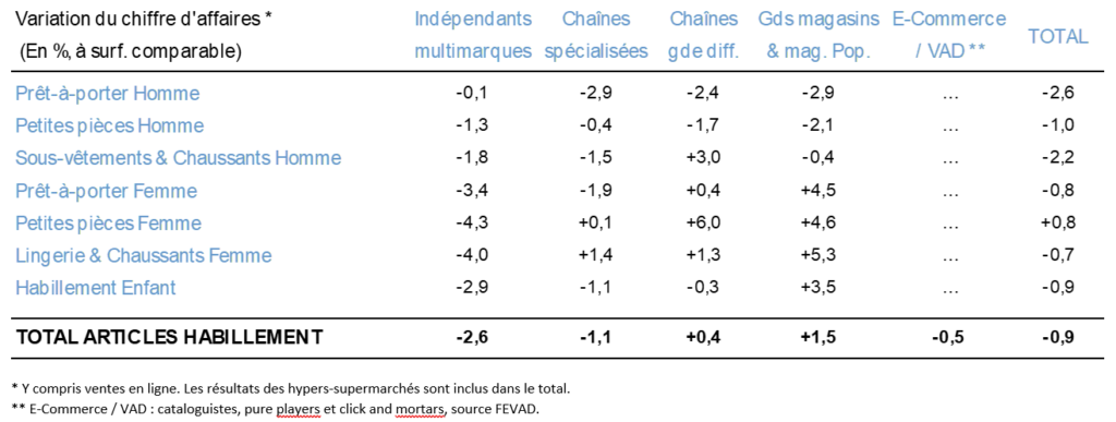 Sur les neuf premiers mois de 2025, les ventes d’articles d’habillement ont reculé de 0,9 % en valeur par rapport à la même période de 2024. À prix constants, la baisse atteint 1,9 %, signe que la hausse des prix, sans avoir totalement disparu, reste désormais contenue. Les chiffres d’affaires sont toujours très en retrait par rapport à 2019 (- 8,0 % en valeur)