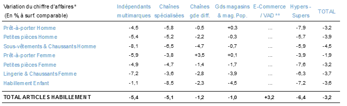 Les résultats du mois de décembre sont compris entre une hausse de 2,0 % pour le E-Commerce/VAD et un retrait de 7,3 % pour les indépendants multimarques.
